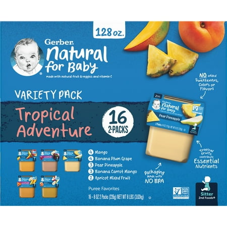 Gerber Baby Food Stage 2 Tropical Adventure Variety Pack Puree 2oz Tubs (32 Pack)