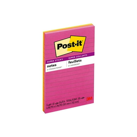 Post-it Super Sticky Notes, Lined, 4" x 6", Assorted Brights, 3 Pads