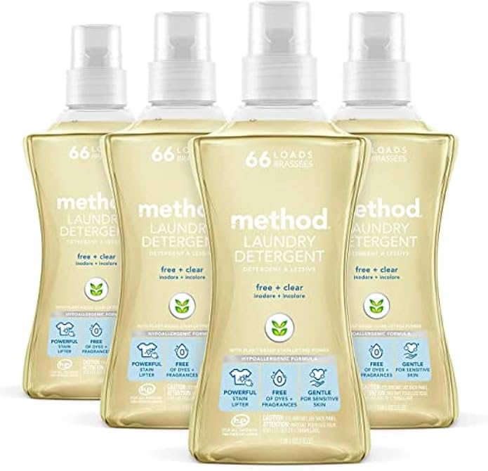 Method Liquid Laundry Detergent, Hypoallergenic + Biodegradable Formula, Plant-Based Stain Remover, Fragrance Free + Clear, 66 Loads per 1.5 Liter Bottles, 4 Pack (264 Total Loads), Packaging May Vary