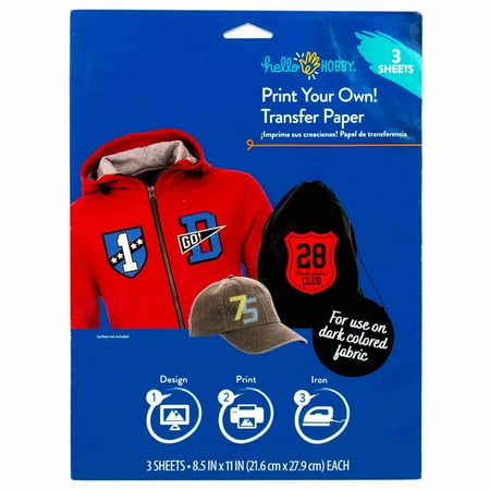 Hello Hobby Print & Transfer White Paper Sheets for Dark Colored Cotton Fabric, Use with Ink Jet Printer, Includes 3 - 8.5" x 11" Sheets