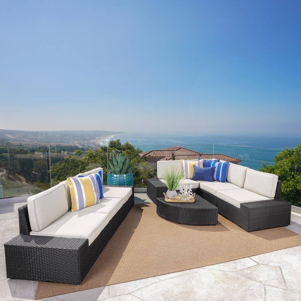 Noble House Eduardo Grey 8-Piece Wicker Outdoor Sectional Set with White Cushions