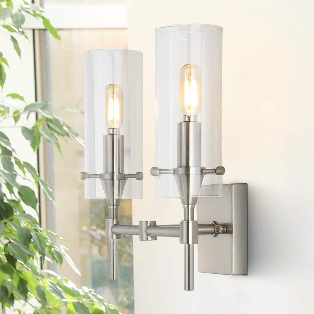 Cato 13.5" 2-Light Modern Farmhouse Iron/Glass LED Vanity, Nickel/Clear