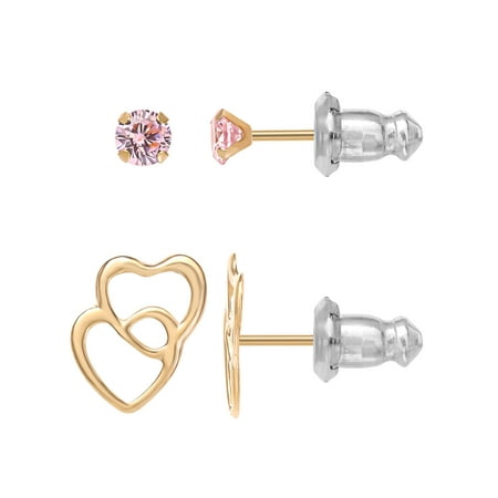 Brilliance Fine Jewelry Girl’s 14kt Yellow Gold Cubic Zirconia and Double Heart Stud Earring Set