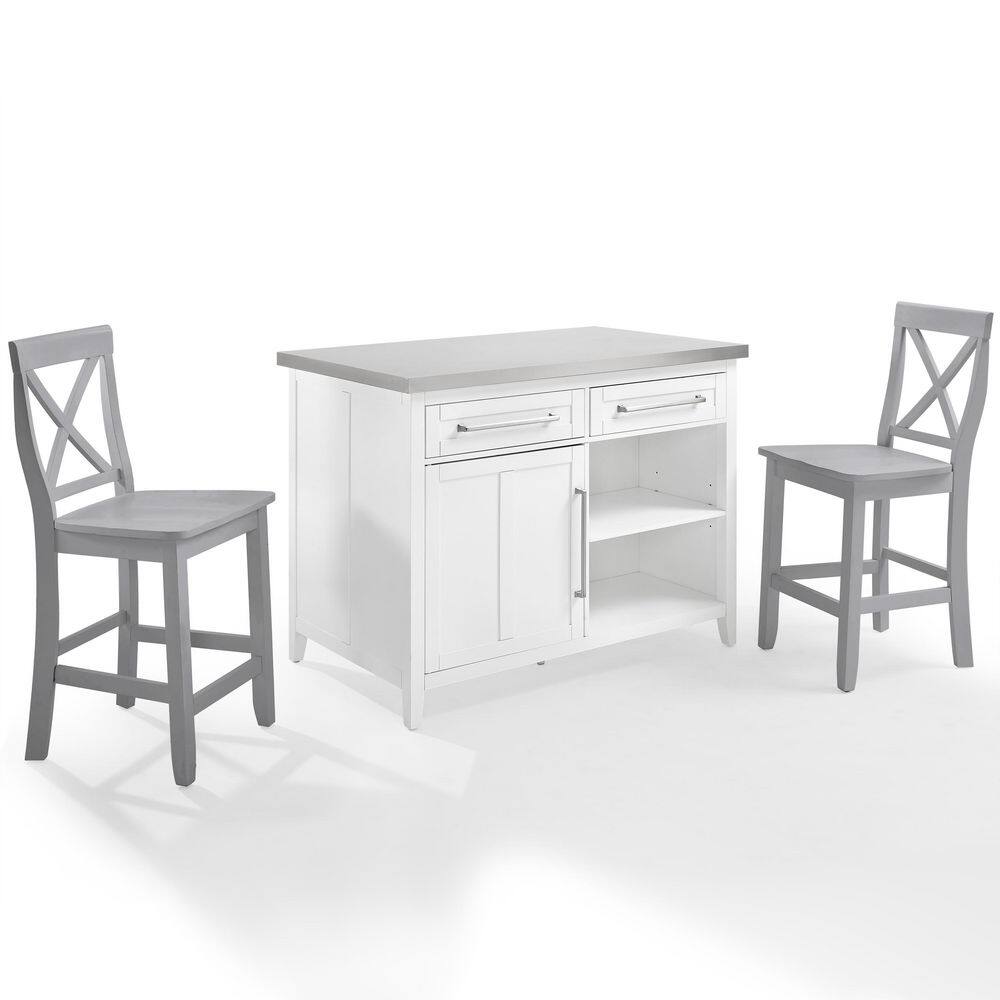 CROSLEY FURNITURE Silvia White Kitchen Island with Stainless Steel Top and X-Back Stools