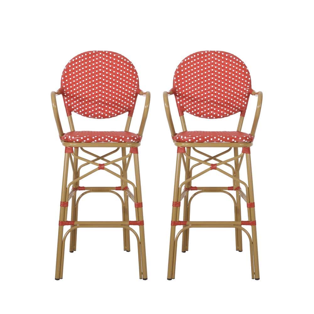 Noble House Ladieu Red and White Aluminum and Wicker Outdoor Patio Bar Stool (2-Pack)