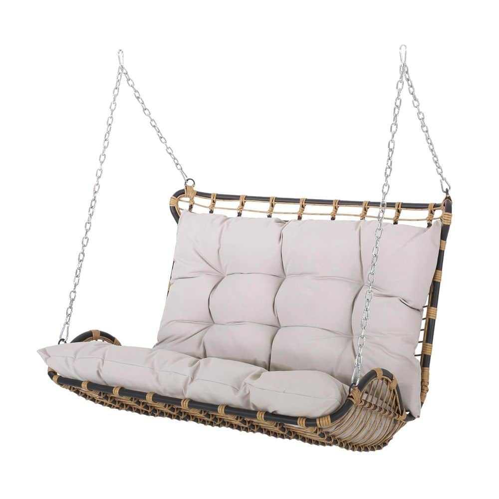 Noble House Hurlbut 2-Person Light Brown Wicker Porch Swing with Beige Cushions