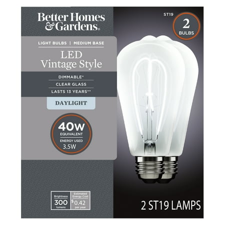 Better Homes & Gardens ST19 LED Vintage Bulb, 3.5W (40 Equivalent) Daylight Dimmable E26 Base 2 Pack