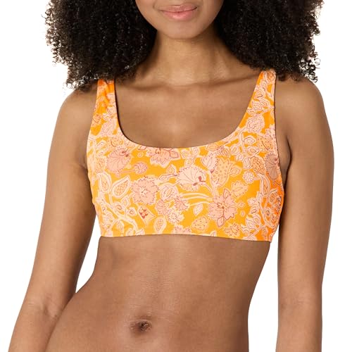 Amazon Essentials Women's Scoop Neck Swim Crop Top, Yellow Multi Folk Floral, Large