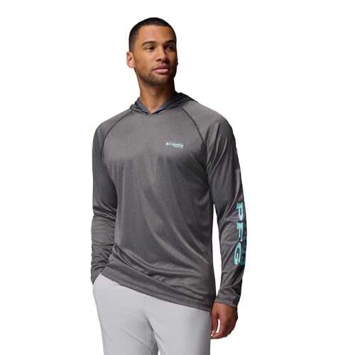 Columbia Mens PFG Terminal Tackle Long Sleeve Fishing Hoodie, Black Heather/Gulf Stream Logo, X-Small