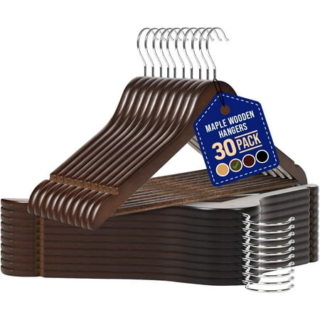 30 Pcs. of Solid Wooden Hangers for Clothes - Heavy Duty Suit Hanger Set with Chrome 360° Swivel Hook- Notches design for Camisole, Jacket, Pant, Dress Clothes Hangers