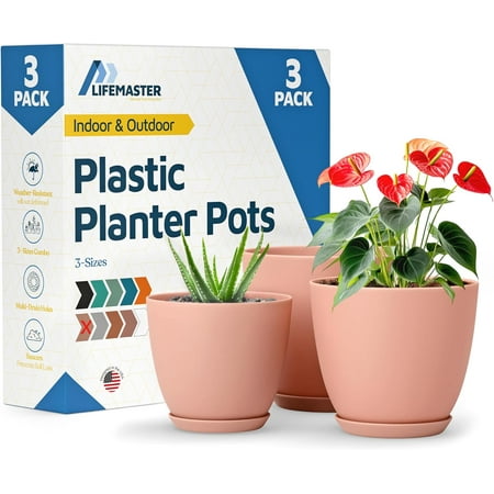 Pink Plant Pots with Drainage Holes & Saucers 3 Packs, Indoor & Outdoor Stackable Plastic Planters in Multiple Sizes for Houseplants & Flowers, Durable & Weatherproof Materials, Matte Finish