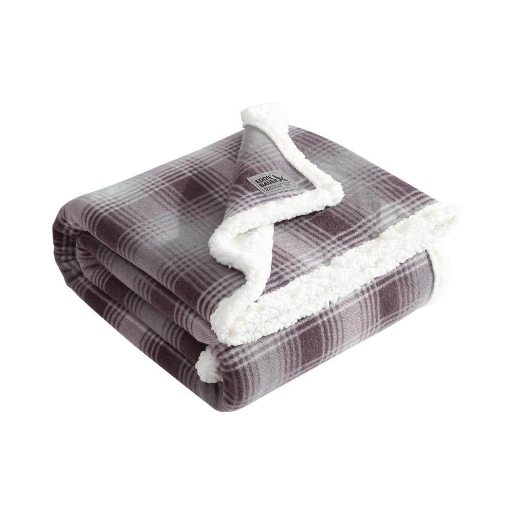 Eddie Bauer Nordic Plaid Plum Grey/Chrome Grey Fleece 50x70 Sherpa Reversable Throw Blanket