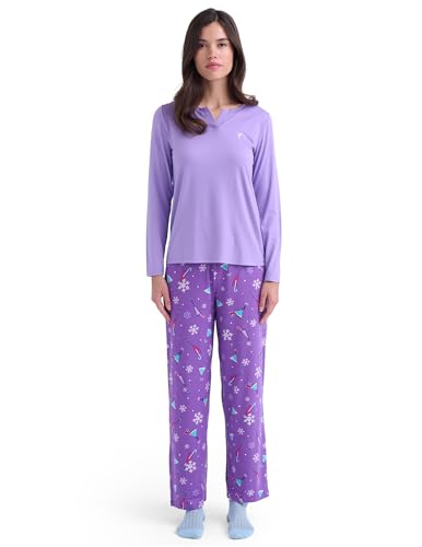 HUE Women's Timeless Soft Jersey Winter Pajama Gift Set Includes Top and Printed PJ Pant, Bougainvillea - Paradise Cocktail, Medium