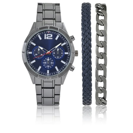 George Men's Gun Metal Watch with Blue Faux Chronograp Dial & Matching 2 Accessory Bracelets in Gun and Blue. 45MM