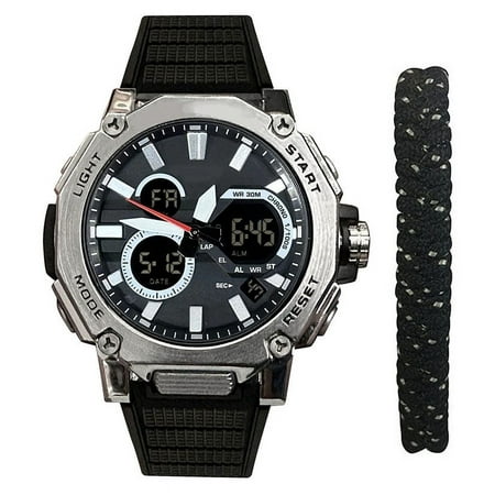 George Men's 2 Piece Silver Metal Watch and Bracelt Set with Black Faux Chronogrph Dial and Matching Bracelet. 44MM