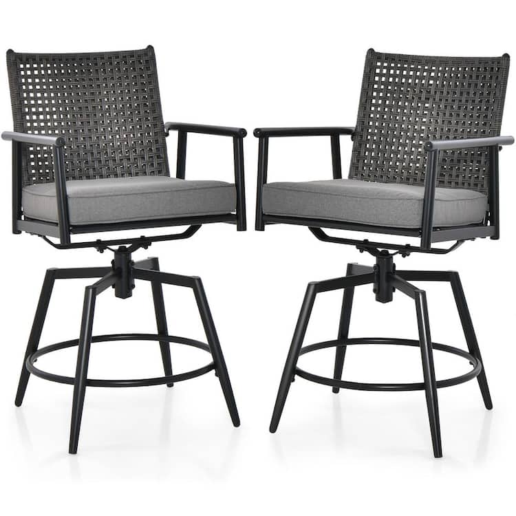Patio Swivel Metal Outdoor Bar Stools Counter Height Bar Chairs w/PE Rattan Back with Gray Cushion 2-Pack