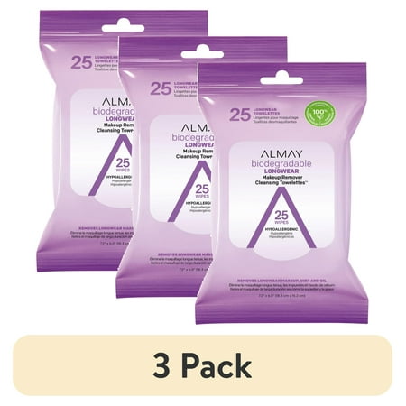 (3 pack) Almay Biodegradable Longwear Makeup Remover Cleansing Towelettes, 25 Count