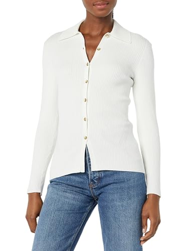 Daily Ritual Women's Fine Gauge Stretch Polo Ribbed Cardigan Sweater, -Ivory, Medium