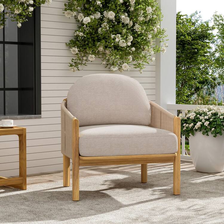 CHRISTOPHER KNIGHT HOME Lincoln Outdoor Solid Wood and Rope Weave Patio Lounge Chair with Beige Cushions, Curved Back, Teak Finish + Beige