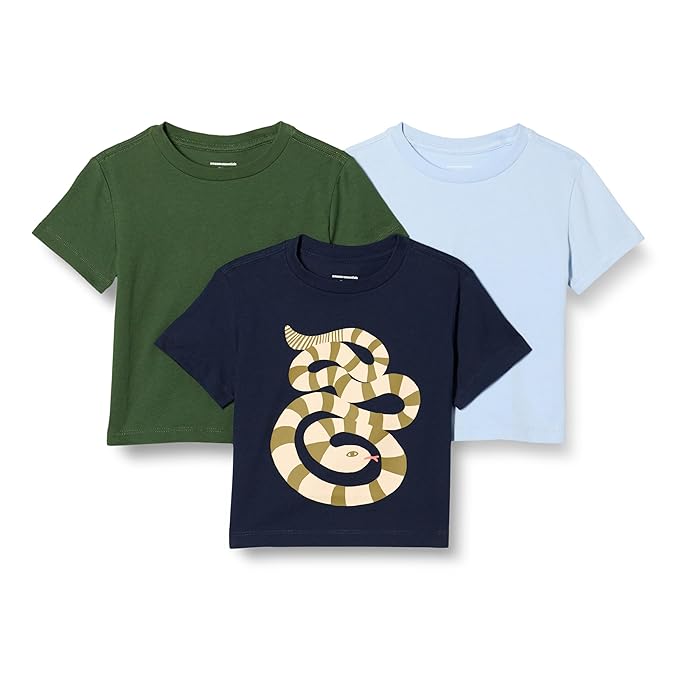 Amazon Essentials Boys' Cotton T-shirts, Pack of 3, Dark Olive/Light Blue/Snake, Medium