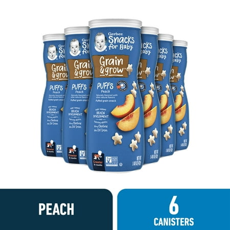 Gerber Snacks for Baby Grain & Grow Puffs, Peach, 1.48 oz Canister (6 Pack)