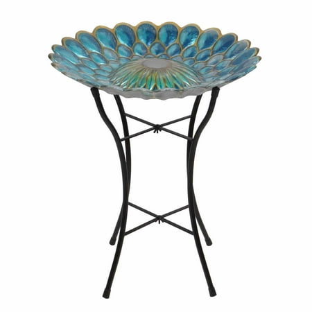 Teamson Home 18" Outdoor Solar Glass Flower Mosaic Birdbath with LED Lights and Stand, Blue
