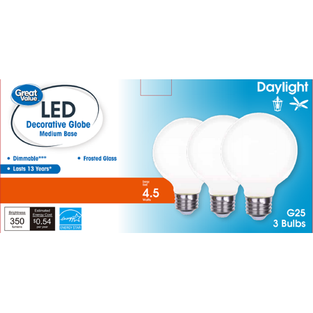 Great Value LED Bulb, 4.5-Watt (40W Equivalent) G25 Globe Shape E26 Base, Daylight, 3-Pack, CA