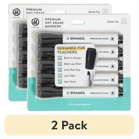 (2 pack) U Brands Dry Erase Markers, 5 Count, Black, Low-Odor, Chisel (5 mm) Tip