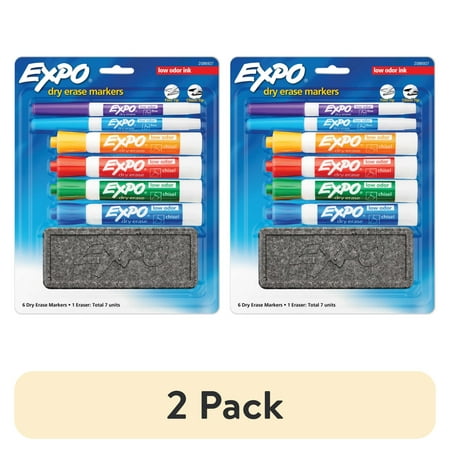 (2 pack) Expo Low Odor Dry Erase Markers, Chisel and Fine Tip, Assorted Colors, Eraser, 7 Piece Set