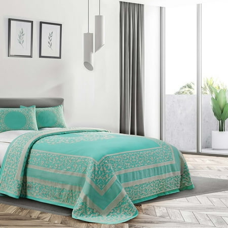 Superior Cotton Blend 3-Piece Bedspread Set, Oversized Bedspread, 2 Matching Pillow Shams, Light Weight Blanket, Jacquard Traditional Medallion Bedding Decor, Adalie Collection, Full, Aqua