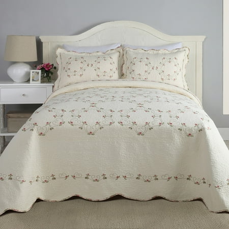 Beatrice Home Fashions Carnation Floral Embroidered Quilted Bedspread, Lightweight, All-Seasons, King, Rose