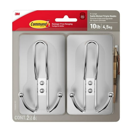 Command X-Large Triple Hook, Satin Nickel, Holds 10 lbs., 2 Hooks, 6 Strips