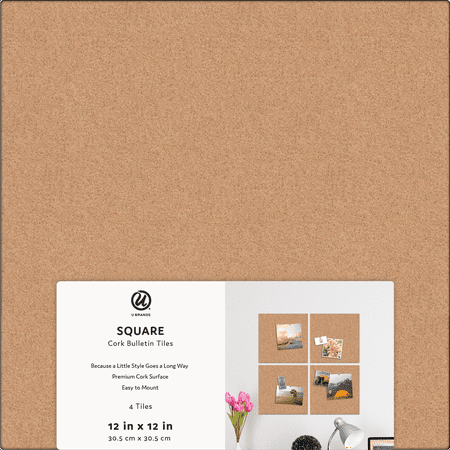 U Brands Square Reversible Cork Tile Bulletin Boards, 12" x 12", Frameless, 4 Count, Brown