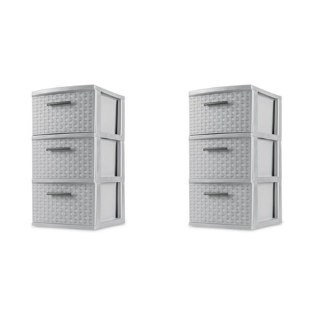 Sterilite 3 Drawer Weave Tower, Plastic Décor Drawers with Pull Handles, Light Gray, 2 Count