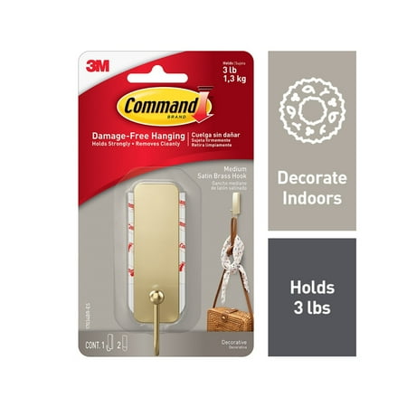 Command Medium Decorative Hooks, Matte Satin Brass, Damage Free Decorating, 1 Hook and 2 Strips