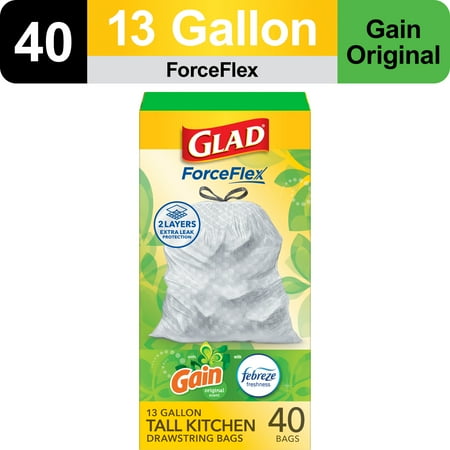 Glad ForceFlex Tall Kitchen Drawstring Trash Bags, 13 Gallon, Gain Original with Febreze Freshness, 40 Count