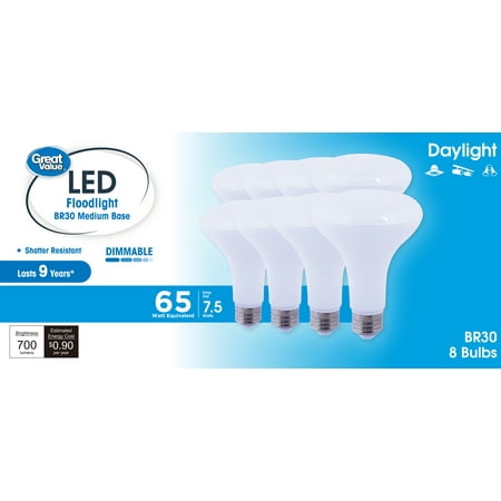 Great Value BR30 LED Floodlight Bulb, 7.5 Watt (65W Equivalent) Daylight Dimmable E26 Base (8 Pack)