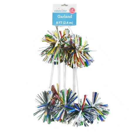 Way To Celebrate! Happy Birthday Pom Garland. 8' Multicolored Poms with Silver. Vibrant PVC.