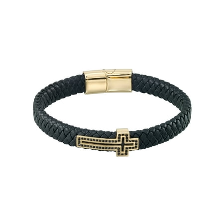 Focus for Men by Focus Men, Cross Bracelet with Simulated Black Diamonds in Genuine Black Leather and Stainless Steel with Gold Tone Ion Plating, 8.5".